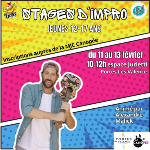 - Stage d’initiation à l’improvisation, le samedi 10 Janvier de 9h30 à 12h30 à la MJC Jean Moulin de BLV