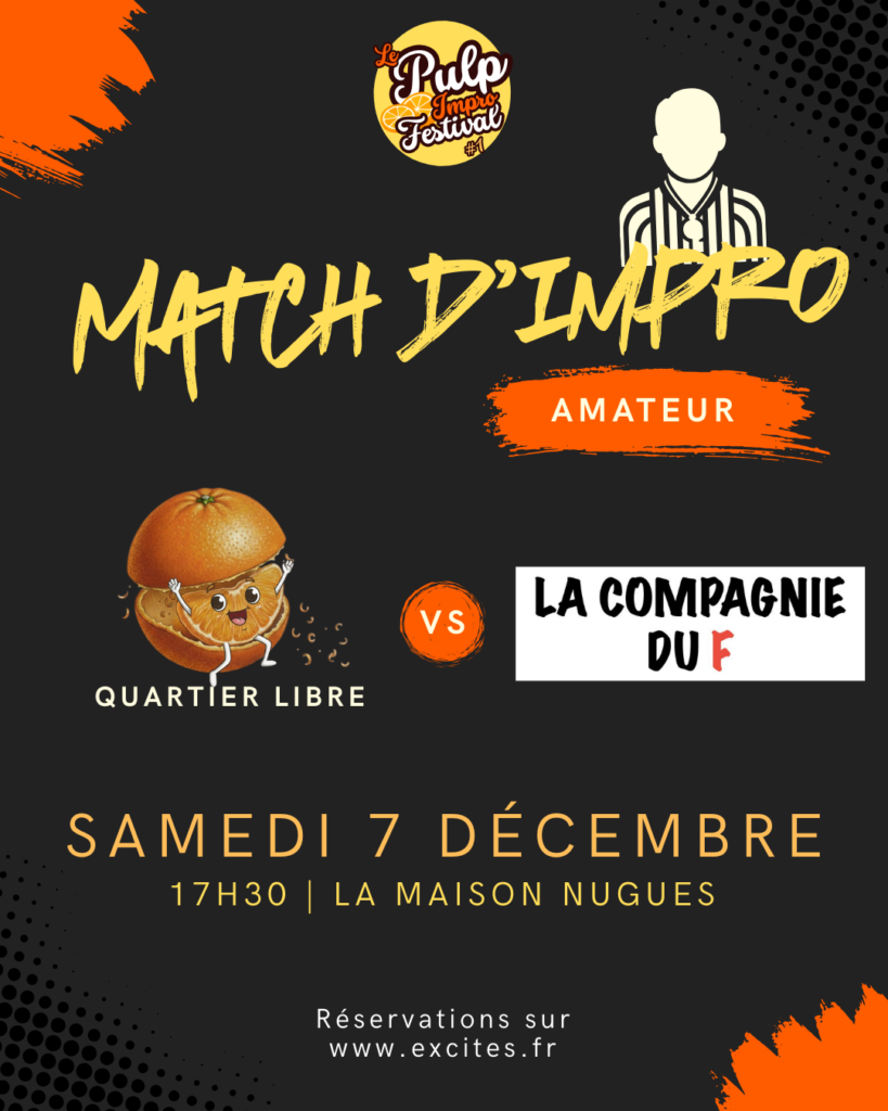 - Place au Match d’impro, son jeu d’équipe et ses contraintes épiques imposées par un arbitre. On compte sur toi pour les départager, public !